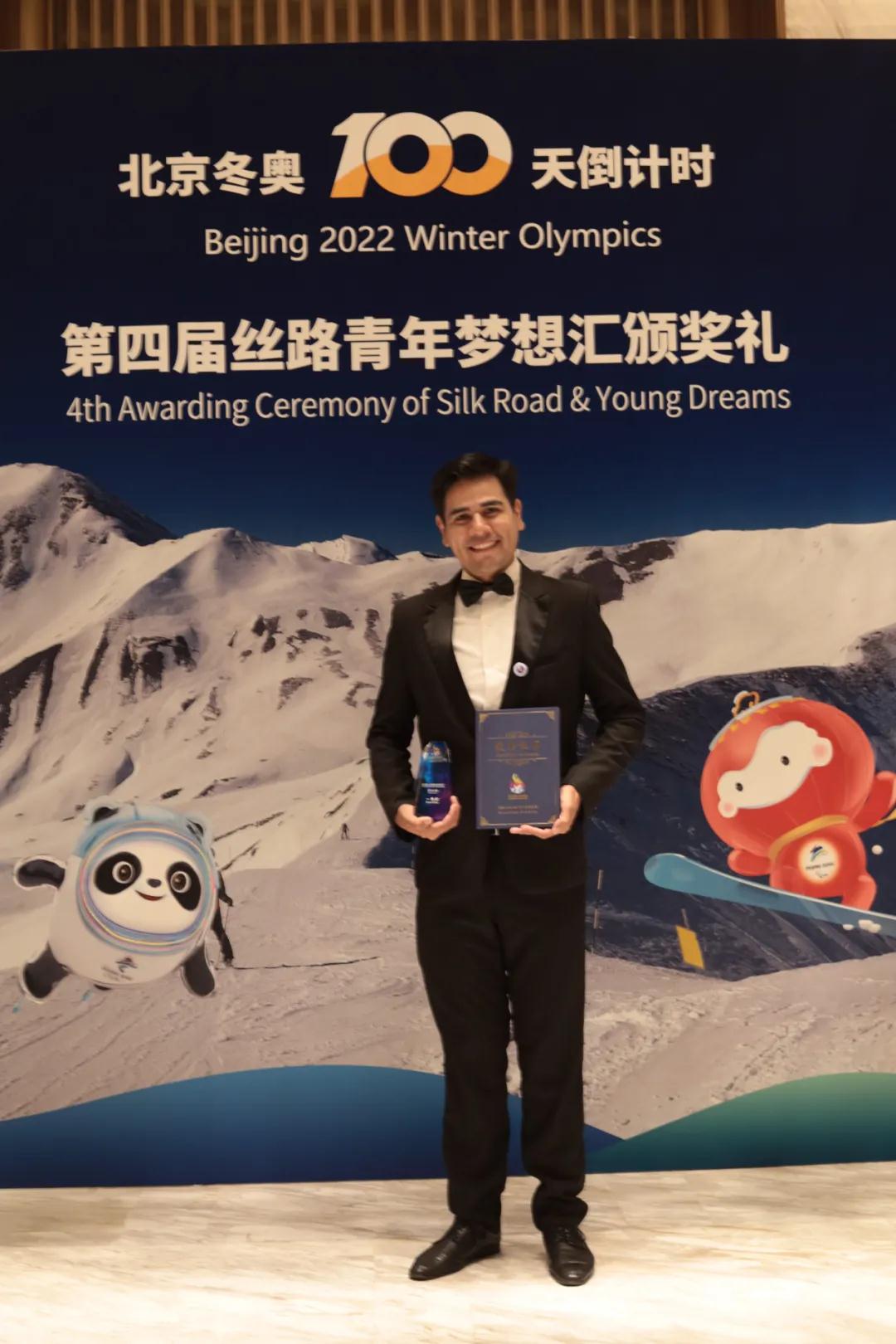 Francisco Arriaga Gomez, a Mexican student from Shenzhen University, receives the first prize at an awarding ceremony in Beijing yesterday for a Winter Olympics-themed performance during the music competition of the fourth Silk Road & Young Dreams (SRYD). Courtesy of SRYD organizers