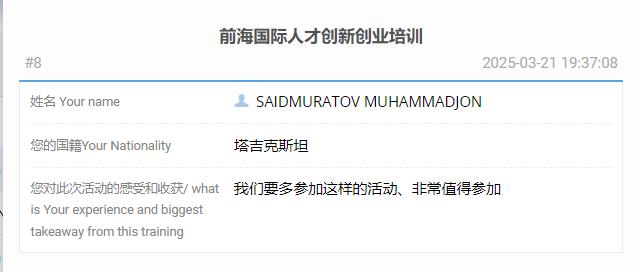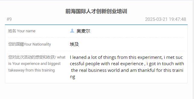 The College of International Exchange at Shenzhen University selected 16 international student representatives with entrepreneurial potential to participate in the "International Talent Innovation and Entrepreneurship Training" program held in Qianhai from March 18th to 20th. During the three-day immersive training, the students engaged in face-to-face discussions with several successful entrepreneurs, systematically learning the core elements of entrepreneurship and gaining insights into the innovation and entrepreneurship ecosystem as well as talent support policies in the Guangdong-Hong Kong-Macao Greater Bay Area. Throughout the program, the students not only expanded their global perspectives and built valuable professional networks but also stimulated innovative thinking through in-depth exchanges with peers from diverse academic and cultural backgrounds. This training program has established a high-quality learning platform for innovation and entrepreneurship, laying a solid foundation for the participants' future career development and entrepreneurial pursuits.