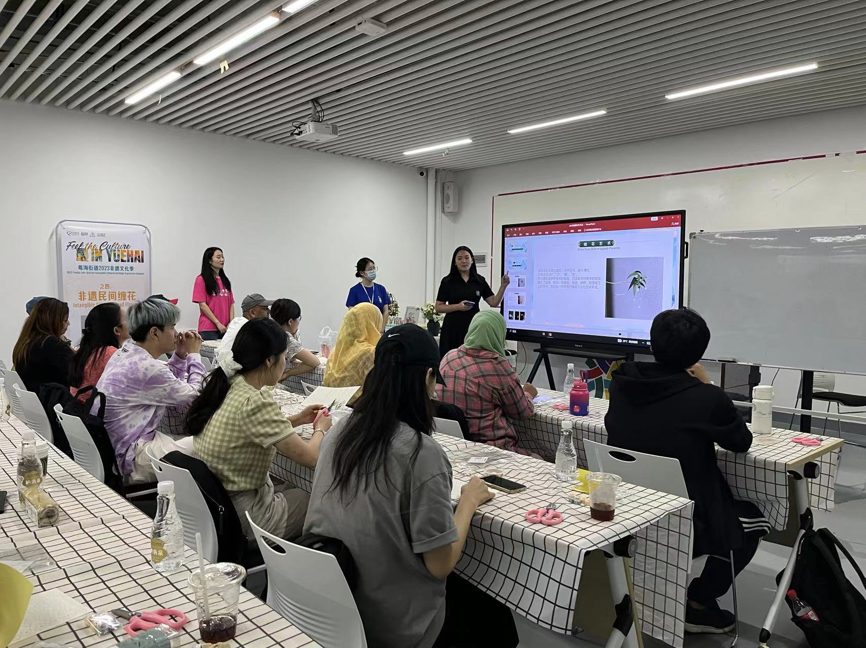 Before the activity began, the lecturer first introduced the materials used in the activity, and help everyone to understand the historical background and production process of winding silk. Tanghua originated in the Ming Dynasty and flourished in the Qing Dynasty. There are very few existing folk collections, and it is listed as the intangible heritage protection project of Hubei Province. A piece of cardboard, a piece of copper wire, some multi-colored silk thread, winding out the flower that never fades in Chinese culture - the winding flower. Also known as "three-dimensional embroidery", "line art sculpture" and "three-dimensional Gongbi painting", it integrates a variety of arts, both lifelike like Chinese painting Gongbi painting, but also has the skill of embroidery with thread. The winding flower has the characteristics of "small", "clever", "fine" and "lively". "Small" refers to the small size of the wrapped flower, "clever" refers to the ingenious idea of the wrapped flower meaning auspicious, "fine" refers to the production of the wrapped flower requires fine skills, "live" refers to the flexible form of the wrapped flower.