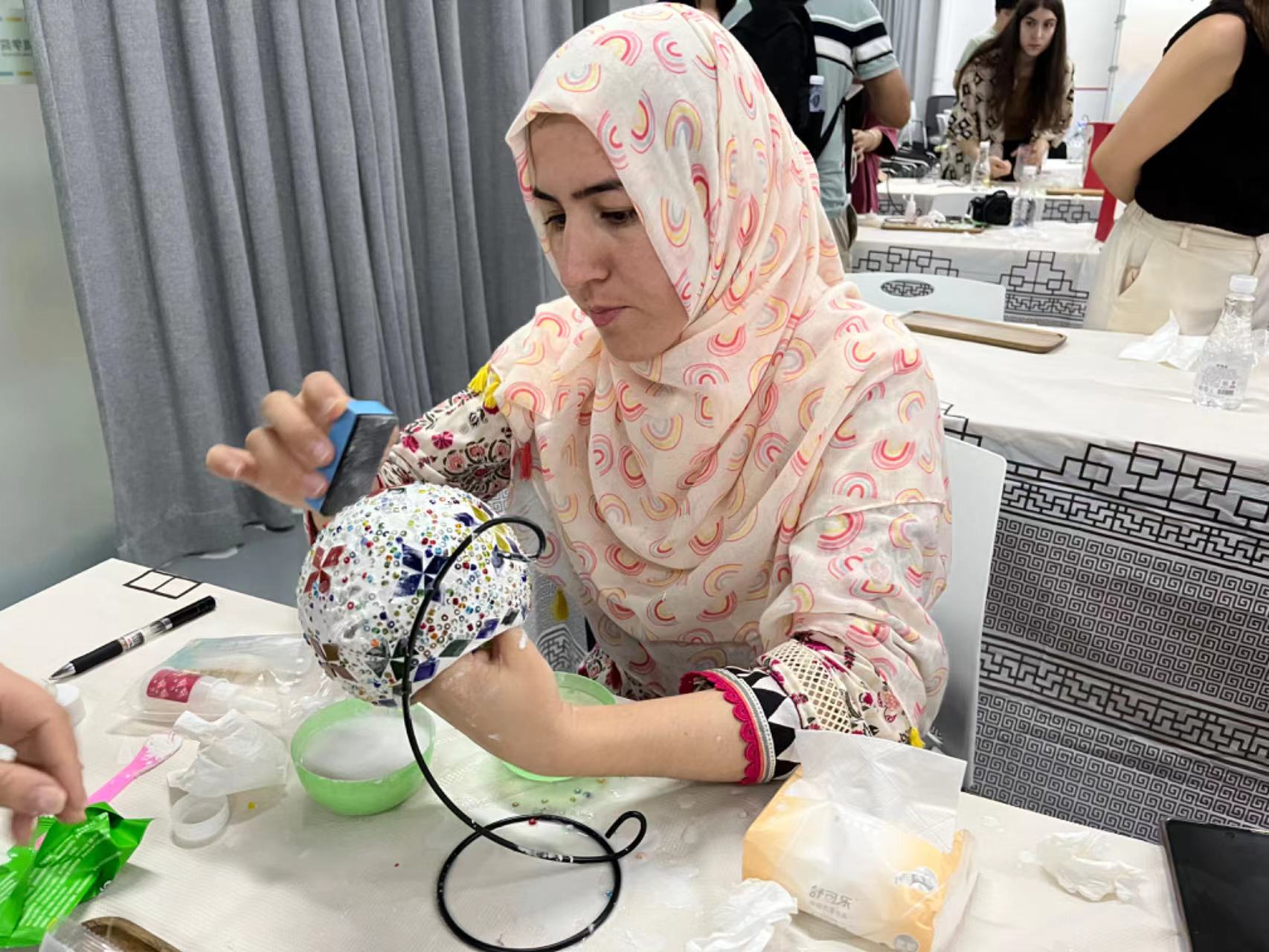 During the production process, the classroom filled with a strong artistic atmosphere. The international students communicate with each other, share their own knowledge and experience, and from time to time, laughter and cheers came.