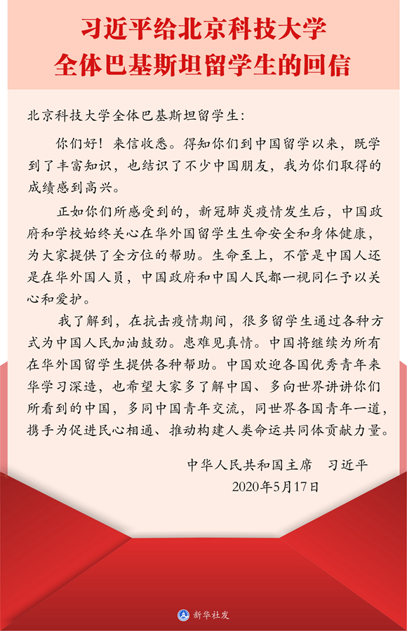 习近平给北京科技大学全体巴基斯坦留学生的回信 新华社发