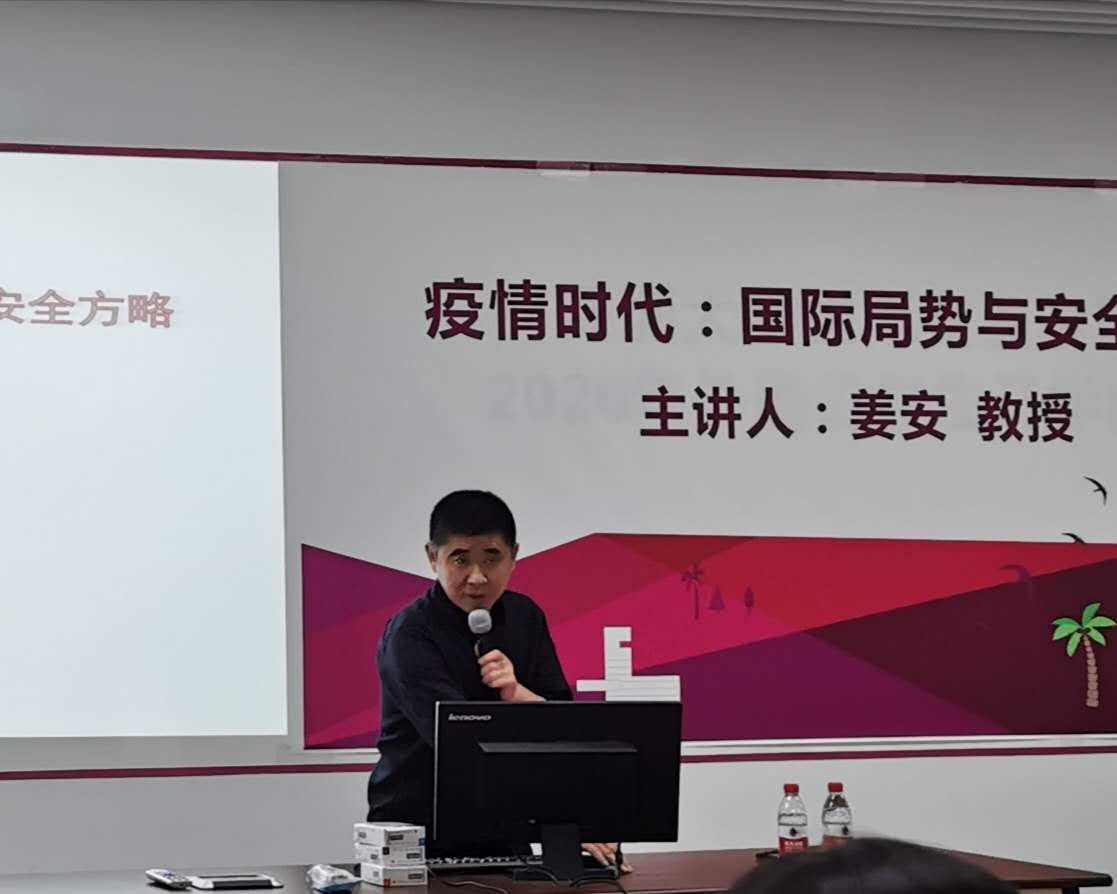 讲座伊始,姜安教授以“百年未有之变局”引出主题,在此背景之下,姜安教授从三个维度对疫情时代中的国际局势与安全方略进行了论述。新冠肺炎疫情影响之下的国际关系呈现出三个征象:第一是世界面临着新冠肺炎疫情以及由此产生的经济?;?、信任危机和能力?;?;第二是疫情时代由于结构性竞争导致的中美分裂;第三是疫情时代世界各国关系特别是中美关系的重构。最后,姜安教授着重分析了疫情时代新形势下中国正在遇到和即将面临的各种风险,中国政府需要勇敢面对、积极应对这些风险,并提出了相应的对策和建议。
