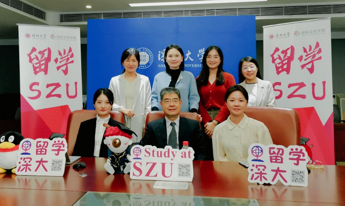 12月11日晚7点30分,日本HSK 留学中国在线教育展深圳大学专场正式拉开帷幕。国际交流学院副院长古维、外国语学院副教授董国民、国际交流与合作部老师黄慧、大湾区创新创业学院博士后汪洋及国际交流学院相关工作人员参加了本次展会。为了达到最好的宣传效果,本次宣讲嘉宾均有留日经历,全程以日语宣讲。此外,国际交流与合作部还特别邀请了两位日本籍交换生Shibuya Soujirou、Sotaro Tachibana参与学校宣讲,以亲身体验为学?!按騝all”。