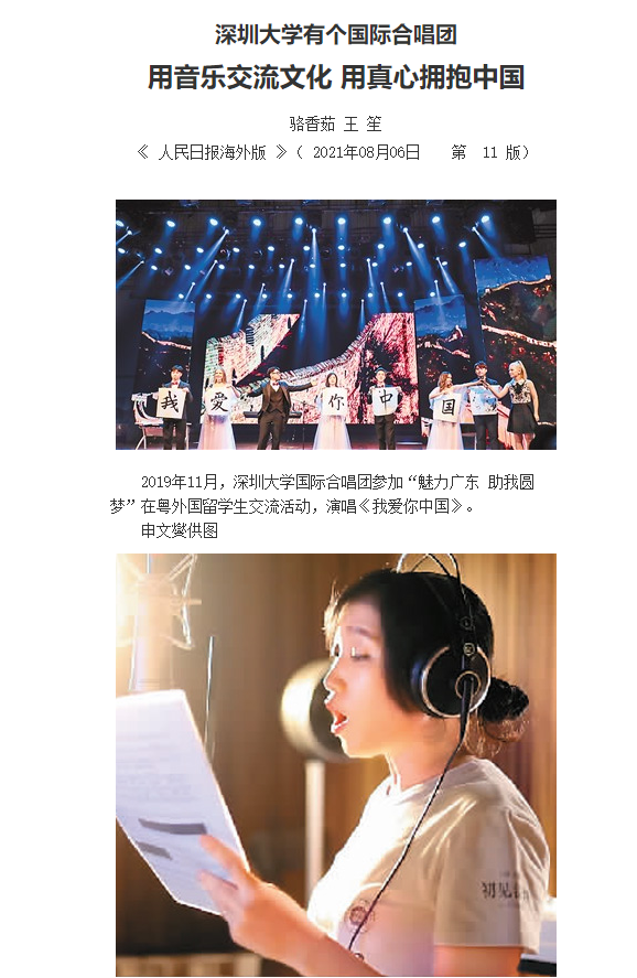以下为《人民日报(海外版)》有关深圳大学国际合唱团的专题报道内容