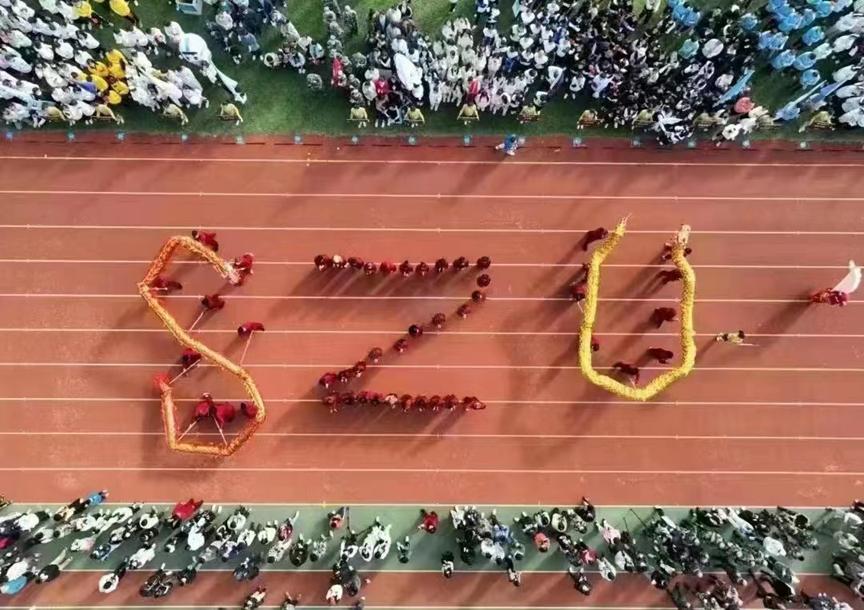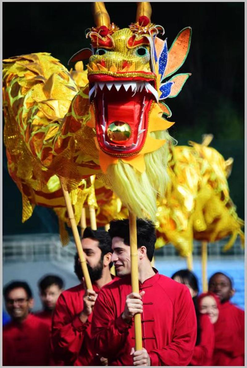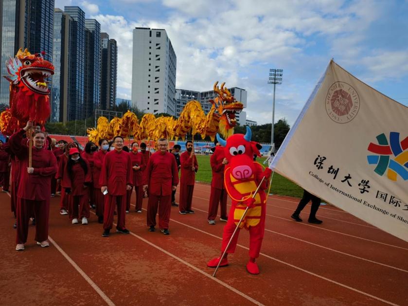 两条威风凛凛的蛟龙穿梭前进,龙游四海腾云飞霄。伴随着慷慨激昂的背景音乐,红色长龙舞动成“中”,金色长龙舞作“国”字,“中国”二字相得益彰。随着音乐鼓点错杂,队伍中央的参赛运动员与老师方阵也适时变换为“Z”字,同两条长龙在左右两边拼成的“S”和 “U”共同呈现出了深圳大学的英文缩写SZU。同学们响亮的“我爱深大”呼声也诠释了大家对于学校的爱意。国际交流学院舞龙队伍深受大家喜爱,观众们的欢呼喝彩声同音乐交织在一起,现场反响热烈非凡。