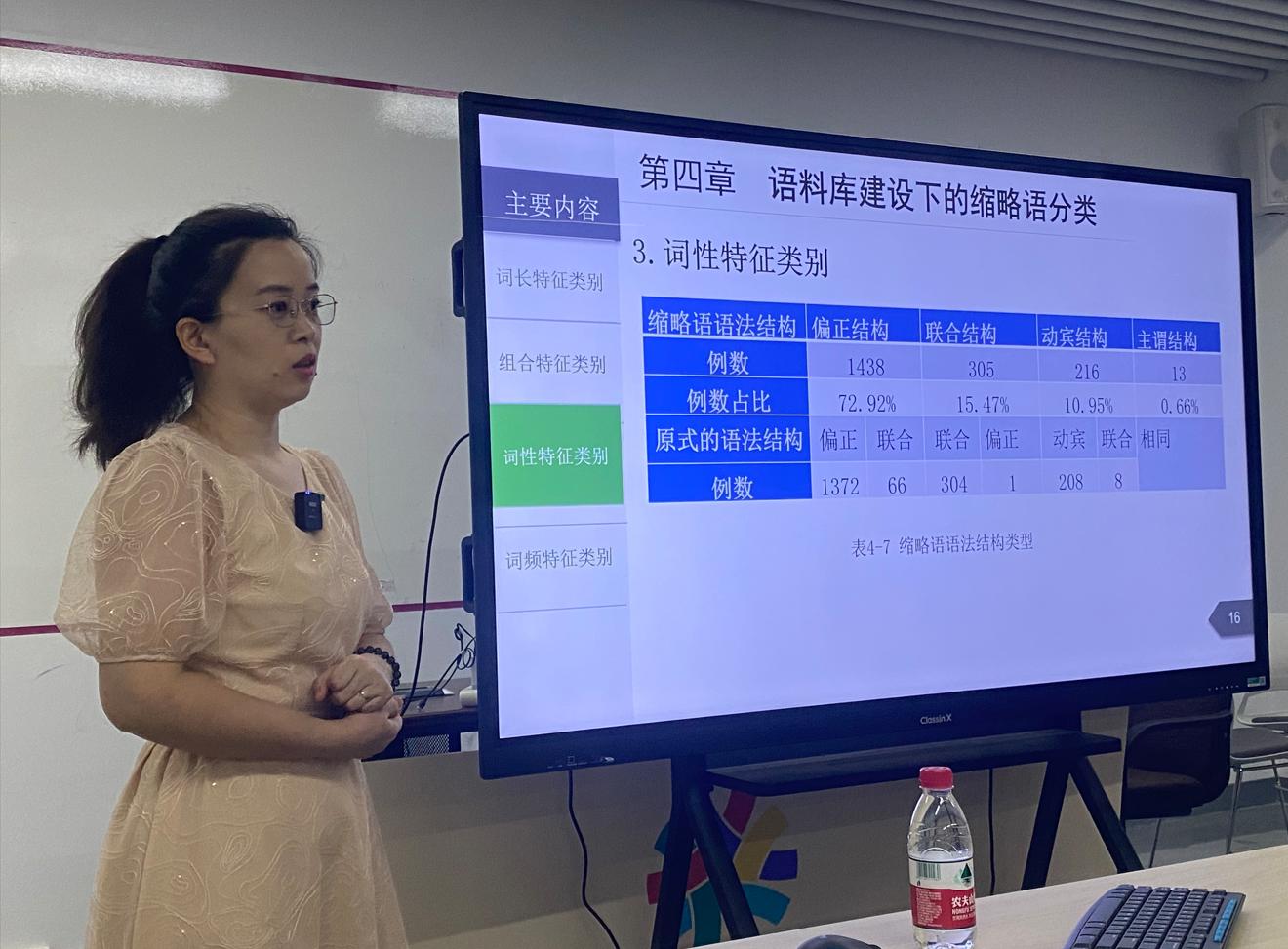 2023年5月26日,深圳大学国际交流学院青年教师季晶静为我院师生开展“基于语料库的现代汉语缩略语研究”的主题讲座。本次讲座由徐继霞老师主持,线上线下共计20名师生参加。