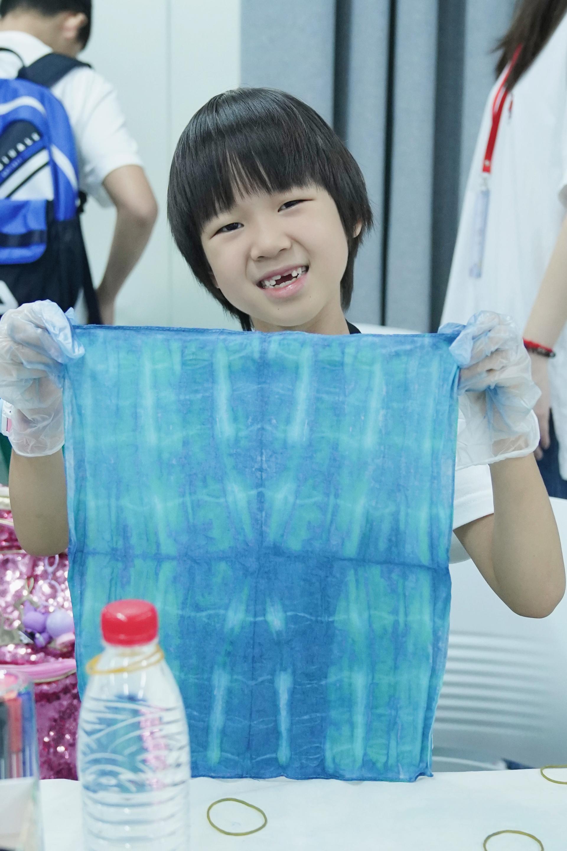 开营仪式后,小朋友们穿上围裙,亲身体验中国传统非遗文化——扎染体验课堂学习非遗扎染的历史和传统含义、扎染的技巧、如何使用染布、染料、如何保存和养护扎染作品,每位小朋友都制作出了自己喜欢的扎染作品。