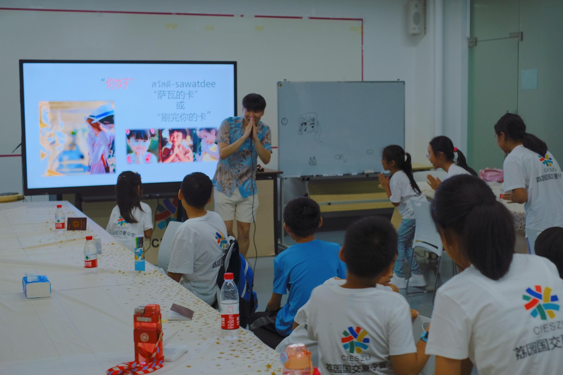 来自泰国的SAE-WANG PHURIN(王锡雄)将自己的课堂化作一架航班,机长“熊哥”带领着小朋友遨游泰国。不仅学习了男女生不同发音的“你好”、“谢谢”,王锡雄老师还给小朋友们讲解了泰国泼水节、泰铢、大象等特色物品。分组学习和讨论环节,男生女生展开PK大赛,响亮的声音响彻教室。