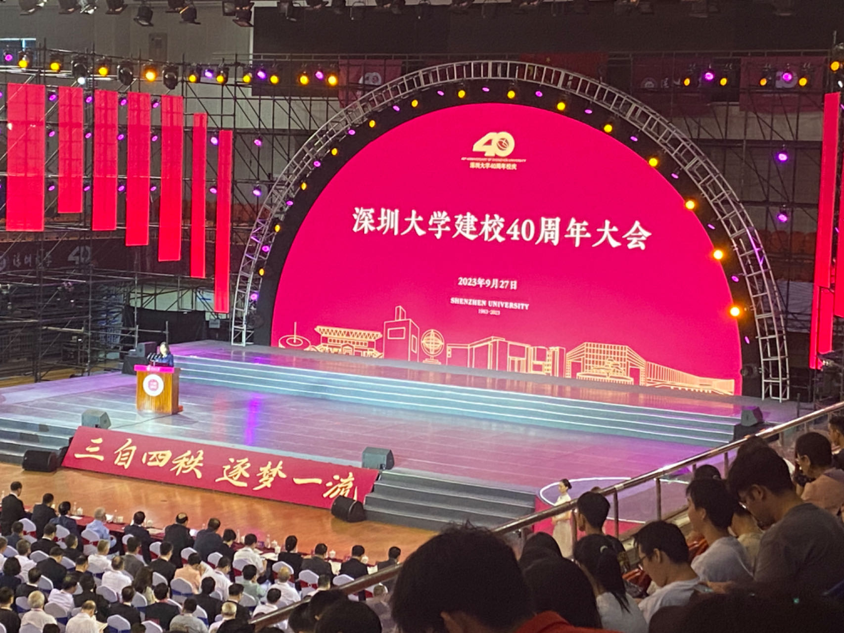 上午11时,深圳大学建校40周年大会于元平体育馆隆重举行,大会以“四秩芳华、逐梦一流”为主题,在庄严而又激昂的气氛中,深圳大学校长毛军发、 兄弟高校代表北京大学校长龚旗煌、校友代表红豆集团董事局主席周海江、深圳市长覃伟中等分别在会上致辞。国际学生校友们认真聆听了领导和代表们的讲话和致辞,并为深大人40年来奋勇拼搏所取得的骄人成绩感到骄傲和自豪。
