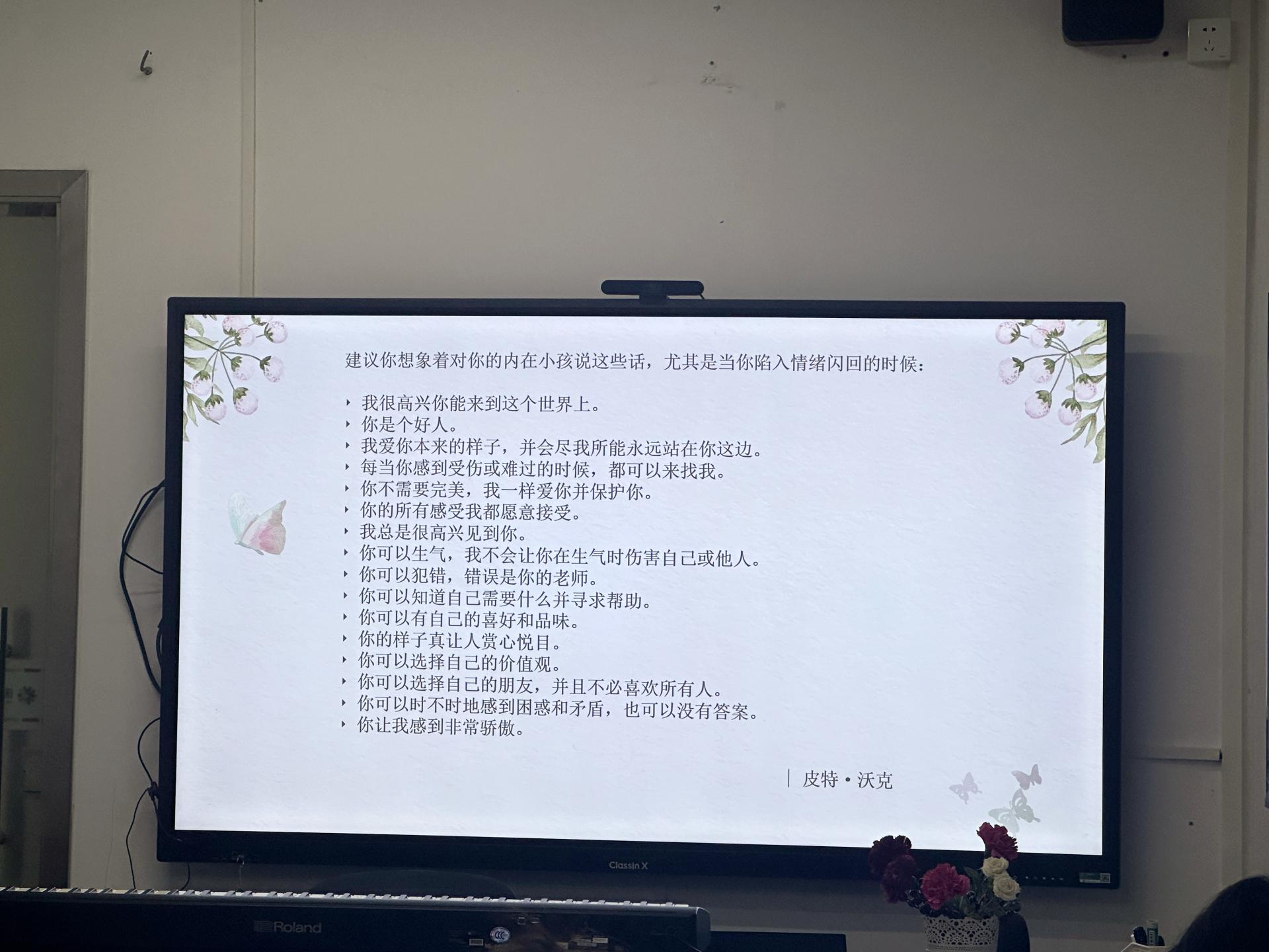 在活动最后,带领者以皮特·沃克的话作结,鼓励同学们在生活中不断增强自我认同感和自我归属感,引导同学们在学习和生活中产生消极情绪时,积极主动地关怀自己,化解消极情绪,拥抱最真实的自己,不断培植自爱的力量。