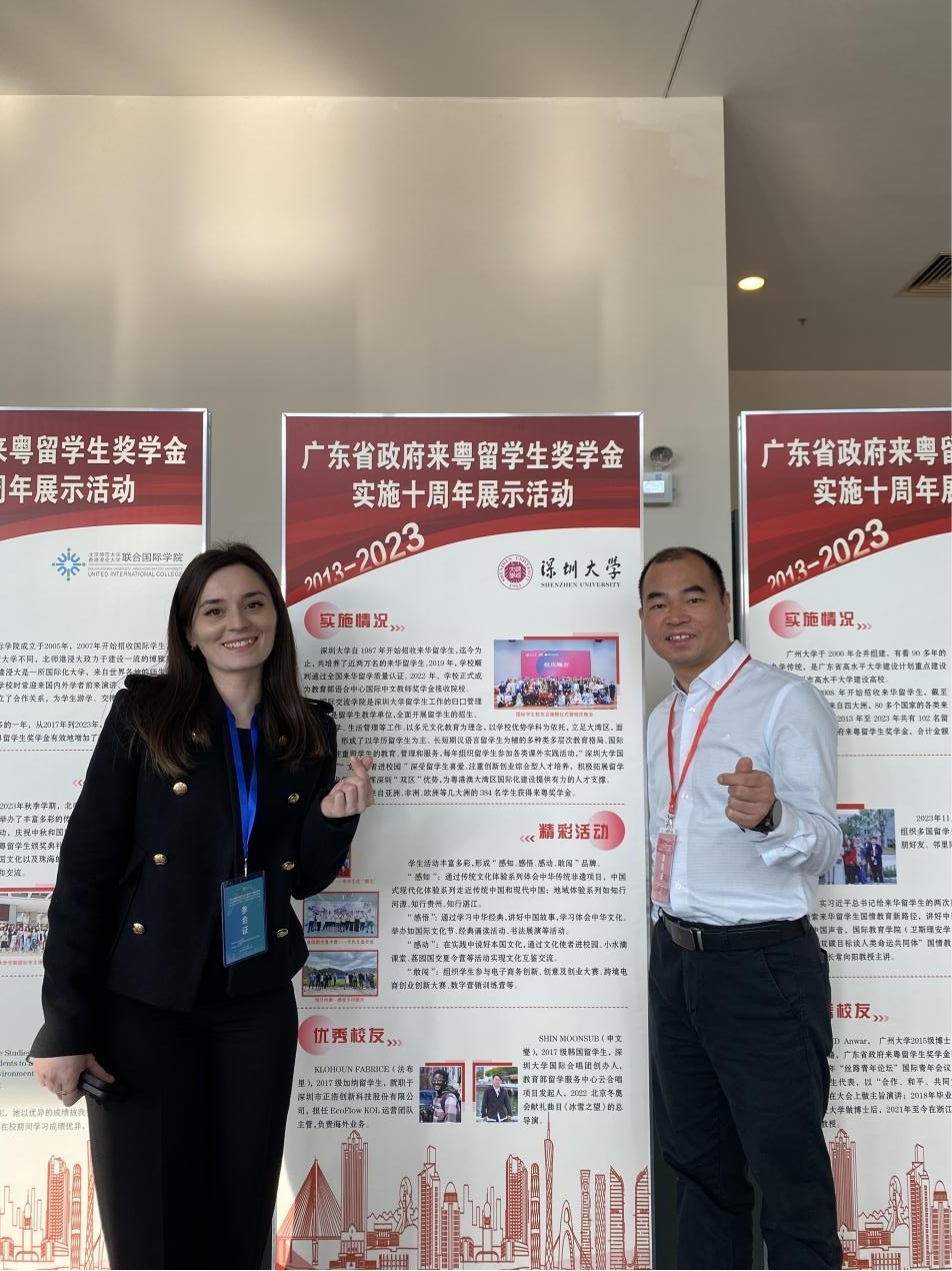 2023年12月28—29日,广东省政府来粤留学生奖学金实施十周年成果展及广东省高等教育学会外国留学生工作委员会2023年年会在汕头大学举行。我校国际交流学院院长潘燕春、国际交流学院辅导员张倩婷、留学生代表娜提亚(GUGUCHIA NATIA)参加展览并出席会议。