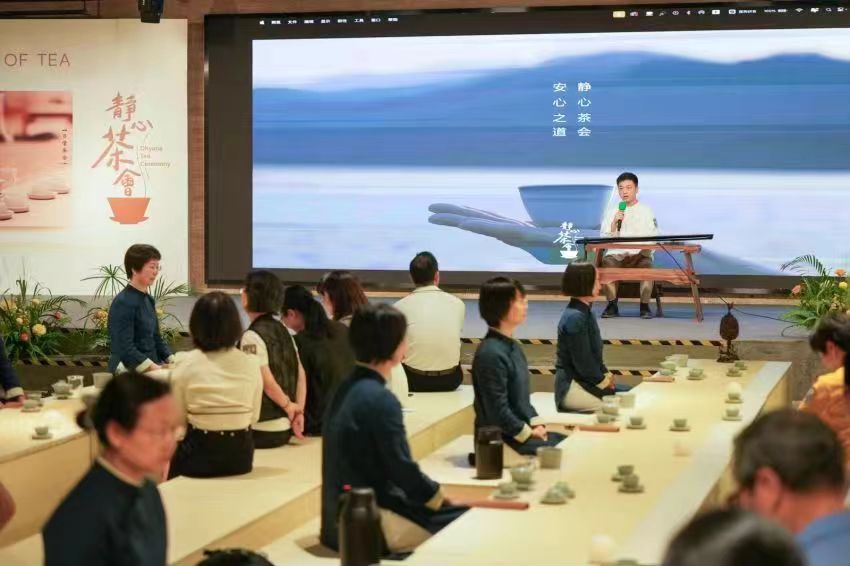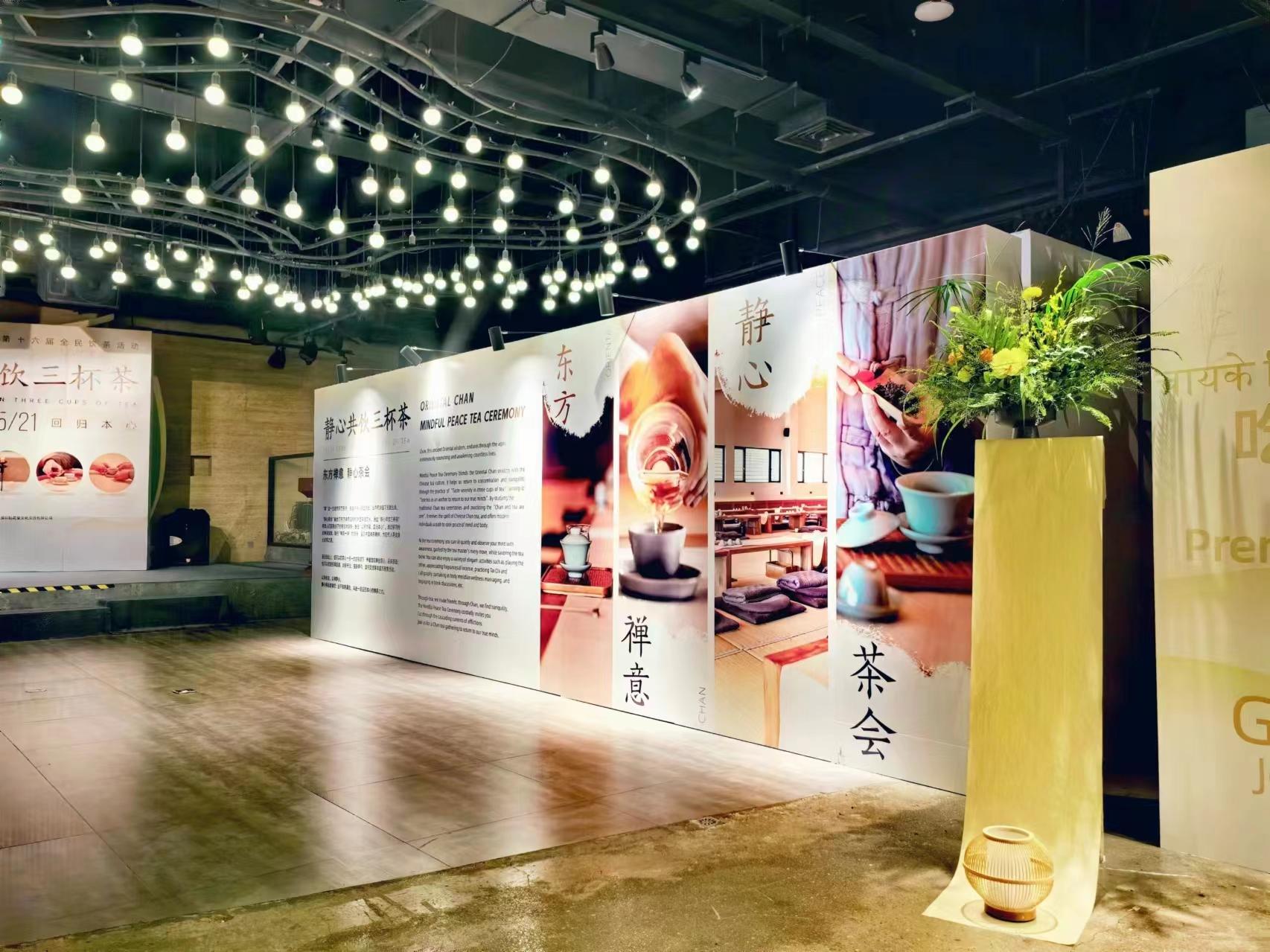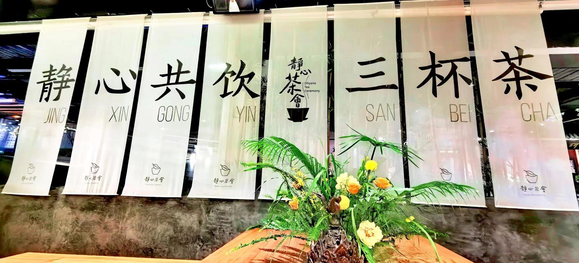 宝安体育馆的茶阅世界,涟漪广场之上,静心茶会即将开启。放好雨伞,收拾好心情,净手静心,入场。禅意的空间布置,简单质朴的茶席,灯光渐暗,一切都静下来,安然静坐。中英双语版的赵州和尚“吃茶去”的故事慢慢道来,禅茶一味也由此传播开来,颇有仪式感的月光茶宴,让我们感受到了月色下天地人的融合,静心、品茶、悟人生?;毓榈毕拢嬉即?,看茶人们泡茶,洁具、投茶、注水、出汤、分茶,缓慢有序,专注、安静、稳定,茶香四溢,静心共饮三杯茶。在三杯茶中,来自波兰的同学喝到了安静,来自韩国的同学喝到了慢节奏,来自意大利的同学喝到了自在舒适。