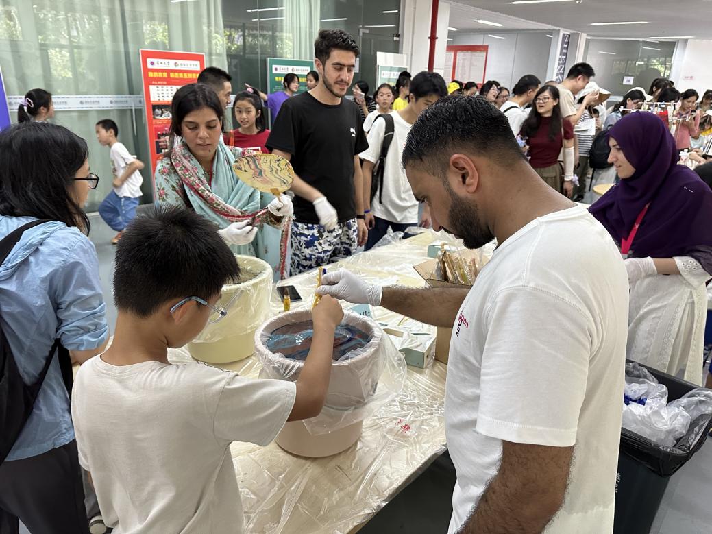 在漆扇制作区,来宾们与留学生同学们一起制作非遗漆扇。大家分享着对中国传统非遗文化的热爱,相互交流,彼此学习,用巧手将一片片普通的扇面,染上五彩斑斓的漆料和独特的图案。在欢声笑语中,大家共同制作出了一把把精美的漆扇,为这次活动留下了难忘的回忆。