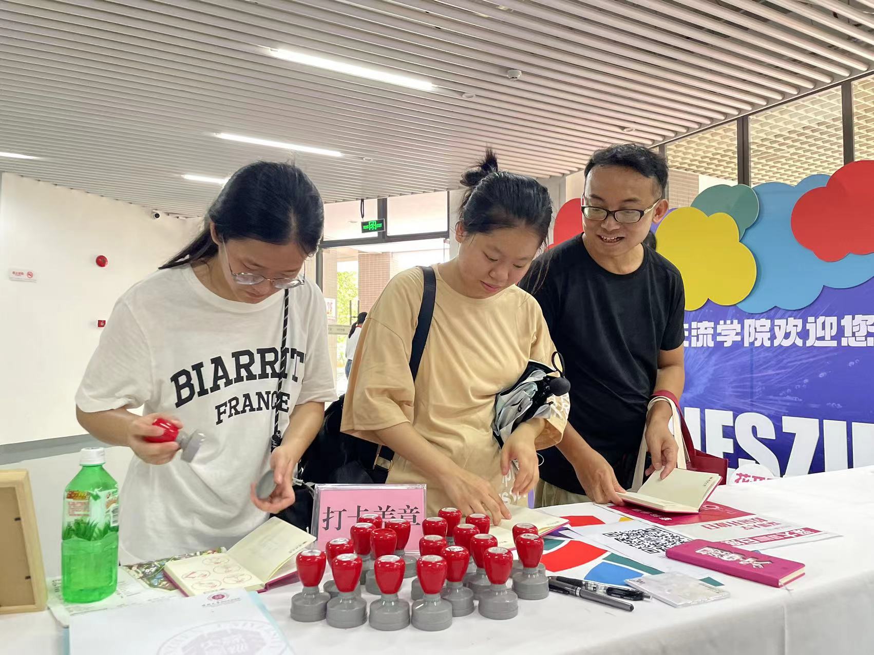 引导志愿者们专业且热情,有条不紊地为来宾们介绍学院打卡点安排,将来宾们逐一引导至打卡盖章区、学院参观区、答题挑战区和漆扇制作区等各具特色的区域。