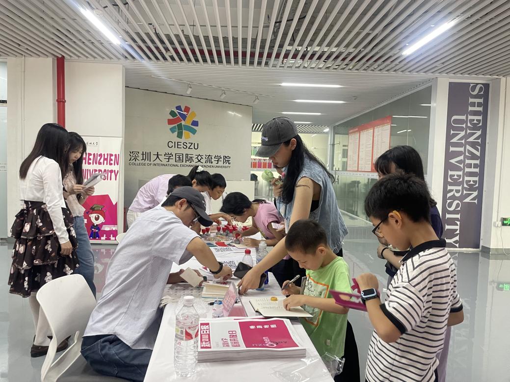 在打卡盖章区,中外志愿者们热忱地等待着每一位来宾,精心准备了学院院徽和文化衫等精美纪念品。来宾可以在打卡点留下美好瞬间,还有机会获得国际文化节特色国家贴纸和印章。学院打卡点还特别为高考生准备了深大特色文创产品,让每一位参与者都满载而归,心中充满惊喜与成就感。