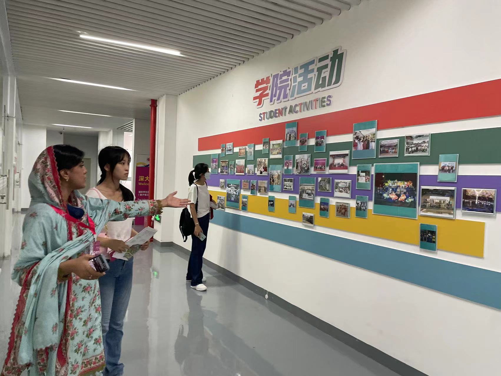 学院参观区志愿者们引领来宾们环绕二楼,一边漫步于学院之中,一边娓娓道来学院的发展历程和独特的办学特色。在参观过程中,来宾们被留学生笑脸墙、茶艺室和学生活动照片墙等展区所吸引,深深地感受到了国际交流学院的活力与多元。