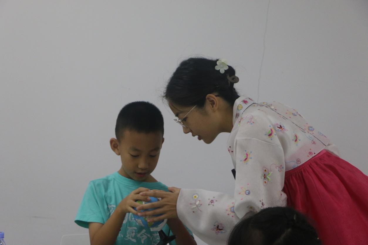 上午9:30至11:00,小班的小朋友们在韩国留学生朴志英(PARK EUN BYOL)的引导下,仿佛穿越时空踏入了迷人的韩国文化世界。朴志英的生动演绎让孩子们对韩国语言产生了浓厚的兴趣,他们不仅学会了基础的韩语问候语,还亲手用韩语写下了自己的名字,初步领略了韩国语言的独特魅力。同时,通过聆听趣味横生的故事,小朋友们还了解了古朝鲜第一代君王——檀君的神话传说,感受到了韩国深厚的文化底蕴。