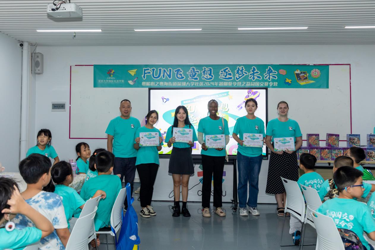 风雨兼程路,硕果满枝头;荣誉加冕时,情谊更深厚。深圳大学党委社区党委书记任毅、深圳大学国际交流学院副书记秦晴为参与夏令营的留学生授课教师隆重地颁发了荣誉证书,并携手共同留下了这份弥足珍贵的合影。这一荣誉,既是对留学生们在教学领域卓越贡献的认可与赞赏,更是对他们不懈追求文化交流、深化国际理解所展现出的精神风貌的高度赞誉。这一刻,它见证了留学生们辛勤付出的汗水与努力,也彰显了学院对多元文化交流和国际理解事业的重视与支持,彰显了学院的开放与包容精神。