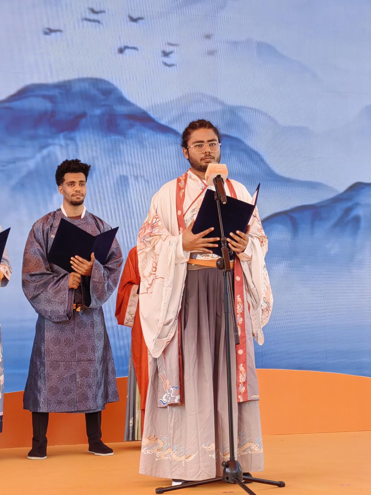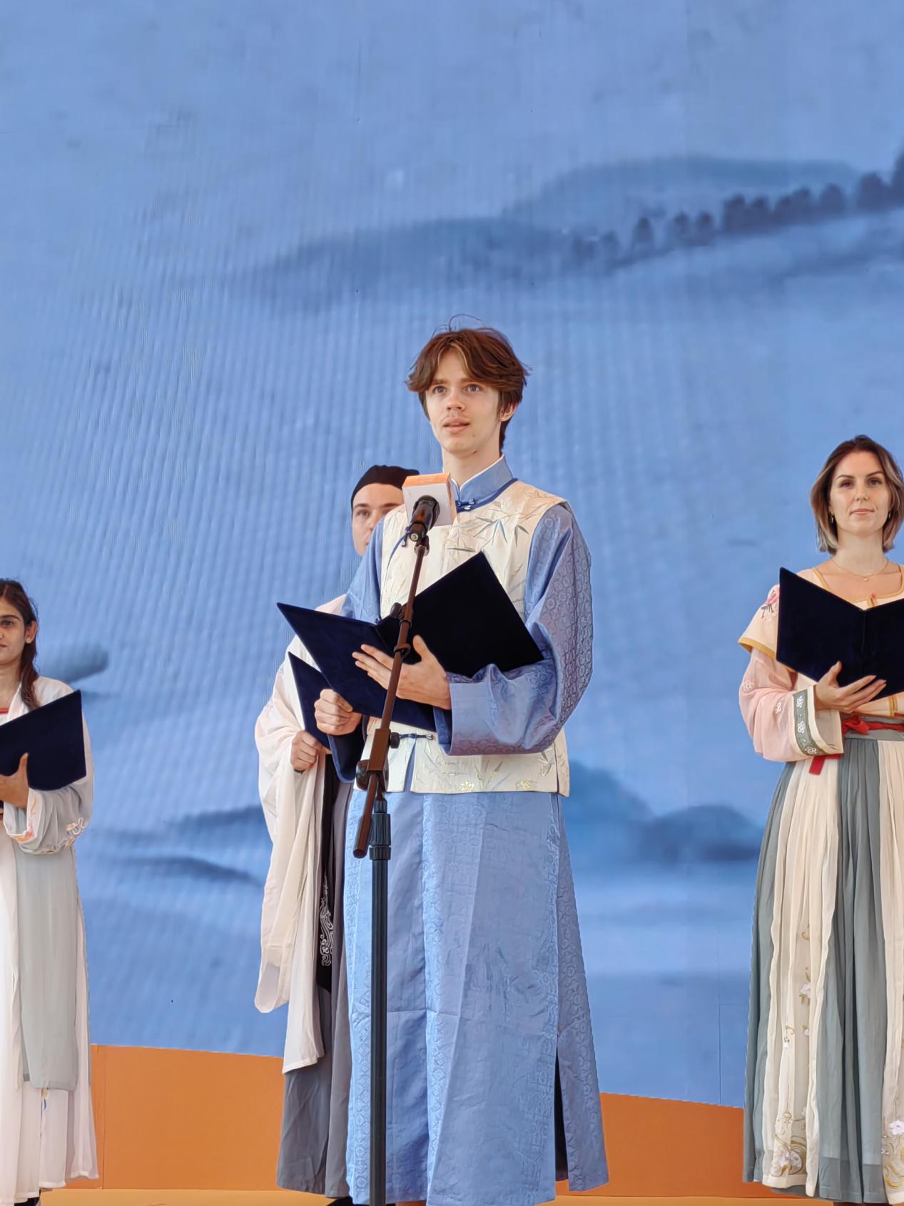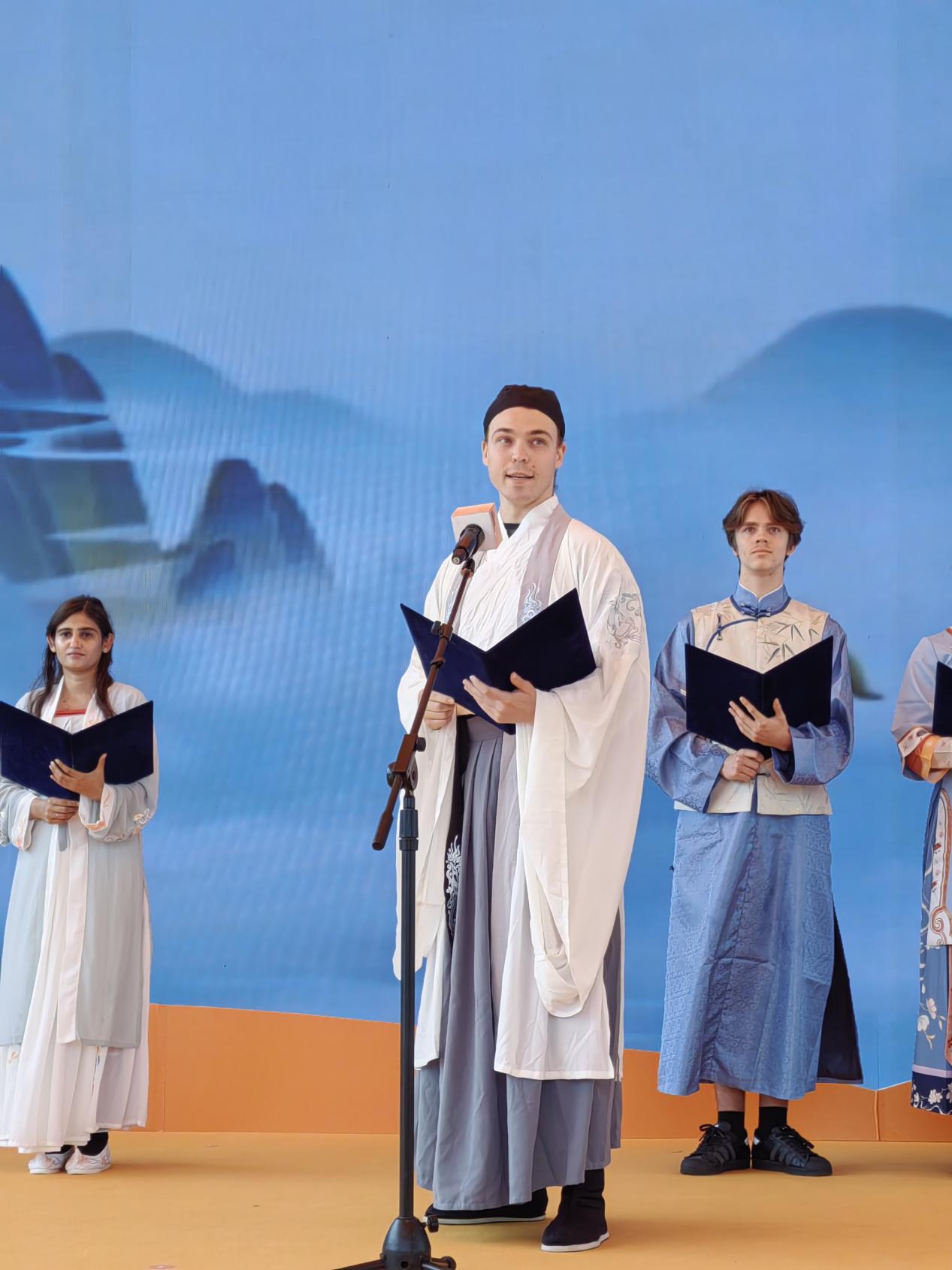 在水幕广场的灯光下,来自尼日尔、巴基斯坦、俄罗斯等9个国家的10位留学生身着传统汉服,如同从古代画卷中走出的诗人,深情地演绎了一系列中华经典诗歌。一首首古诗在他们的诵读中焕发出别样的魅力,如同春日的花开,夏日的清风,秋日的落叶,冬日的暖阳,每一种细腻的情感都在他们的诵读中得到了完美的诠释。他们的声音和汉服的飘逸,共同展现了“书香能致远,诗书气自华”的境界,让人置身于一个充满诗意的世界,感受到了中华文化的无穷魅力和深远影响。