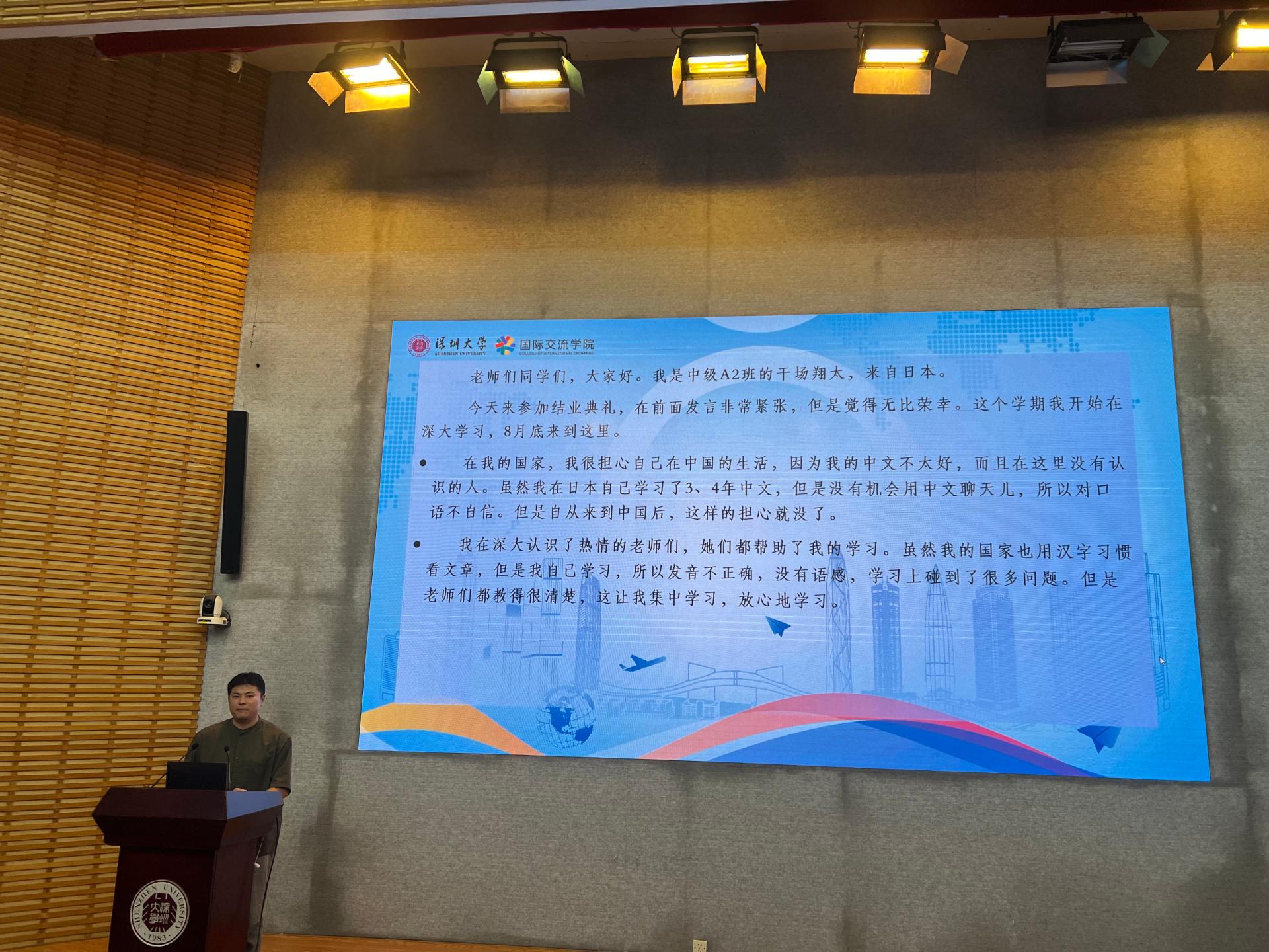 学生代表干场翔太同学(中级2班)和余谱月同学(高级班)也分别上台发言。他们分享了自己的学习心得和感悟,表达了对学院、老师们和同学们的感谢,并表示这将是他们难忘的人生经历。