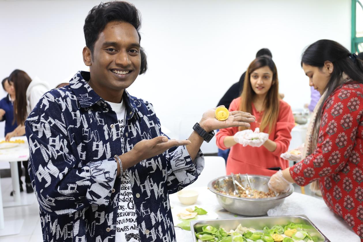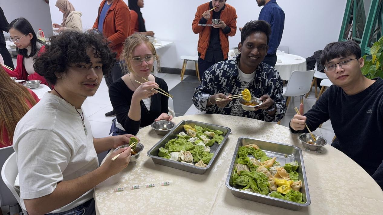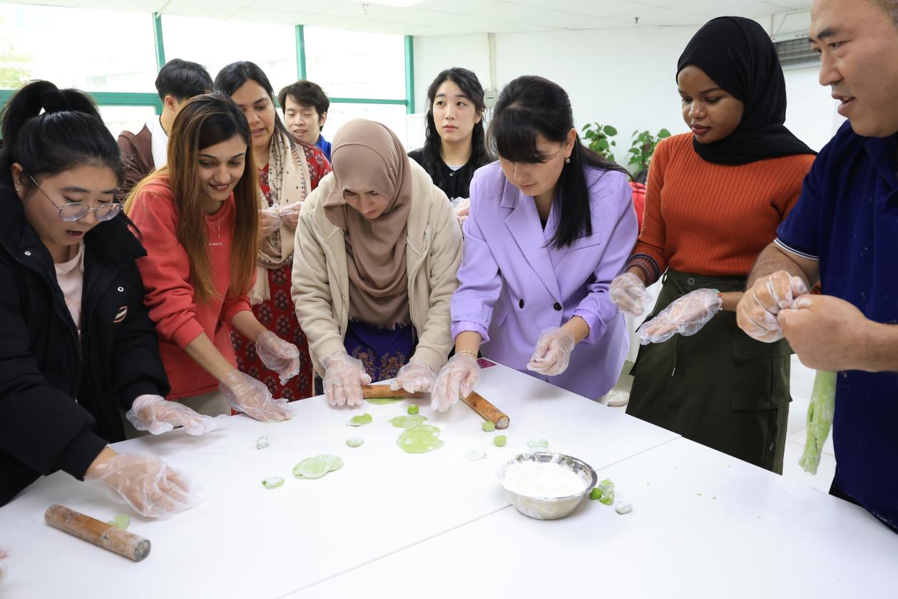 来自不同国家、拥有不同文化背景的学子们齐心协力,一开始学习包饺子的技巧,大家手忙脚乱,但在相互交流、彼此帮助下,逐渐熟练起来。包出的饺子形态各异,有的像弯弯的月牙,有的似饱满的元宝,每一个都饱含着对新年的美好期待。饺子下锅煮熟,热气腾腾,恰似“更岁交子” 的真实写照,不仅填饱了肚子,还在分享品尝的过程中,拉近了同学们的距离,让情谊愈发深厚。