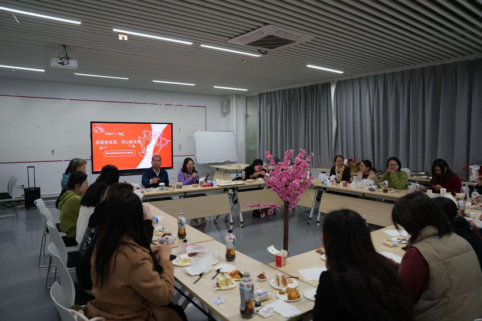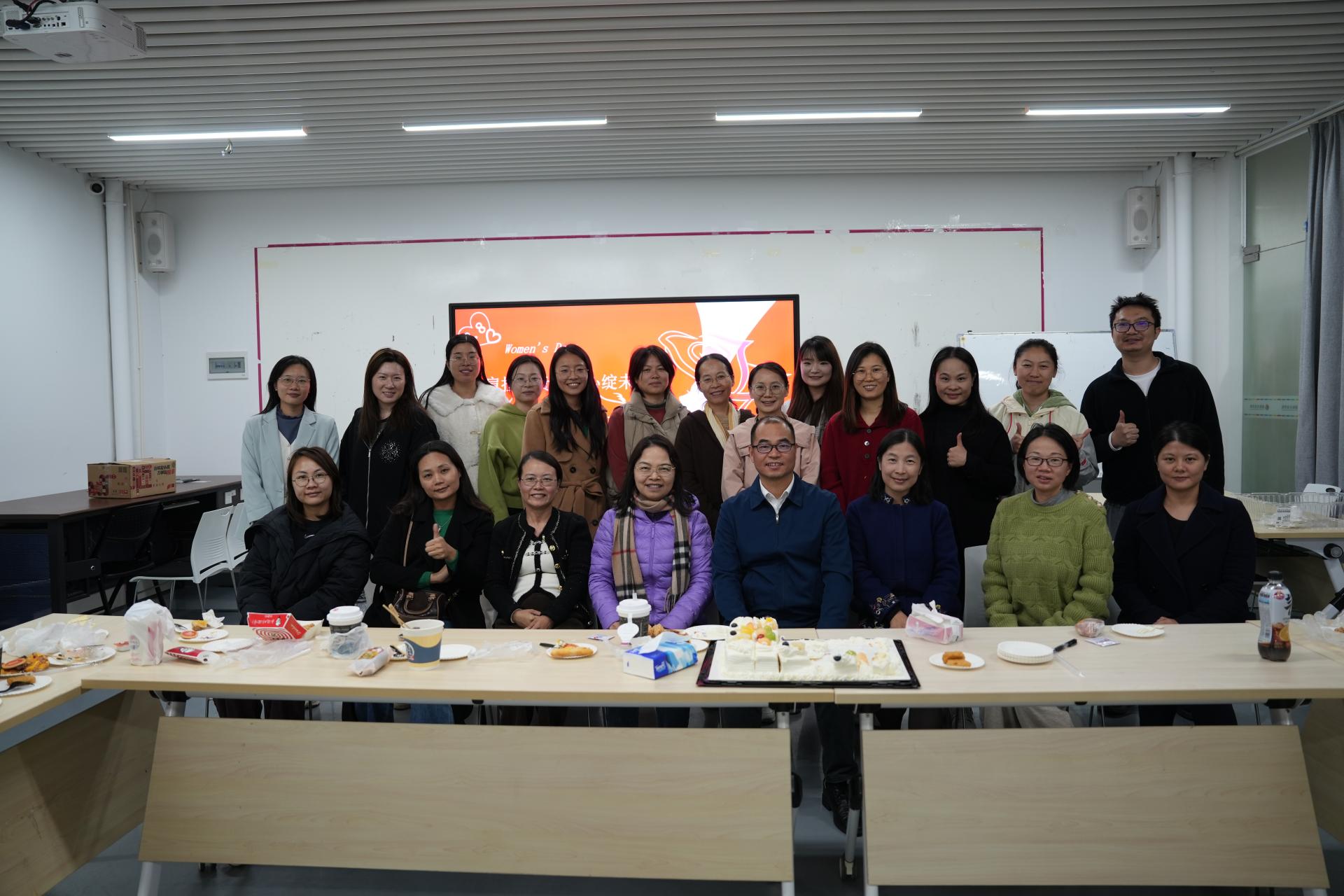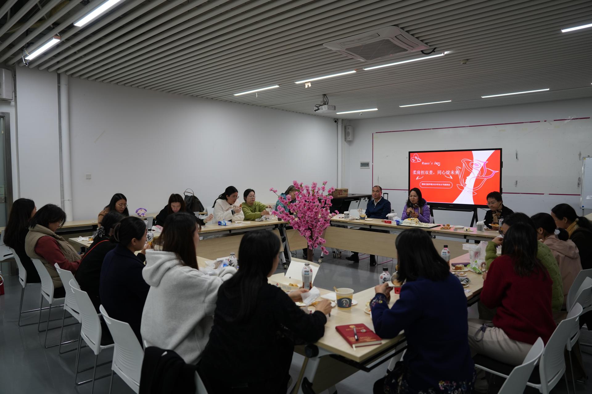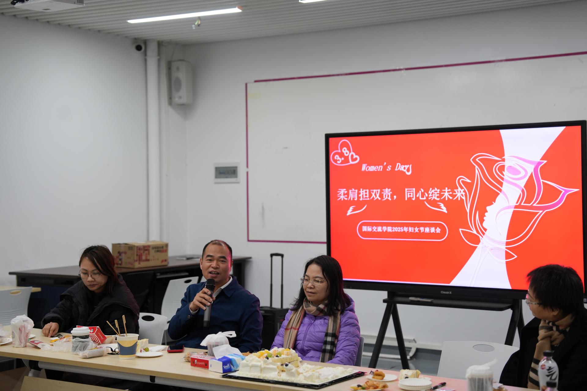 三月八日中午,春意盎然,深圳大学国际交流学院201教室内欢声笑语,其乐融融。为庆?!叭恕惫世投九?,学院工会特别举办了以“柔肩担双责,同心绽未来”为主题的女教职工座谈会。