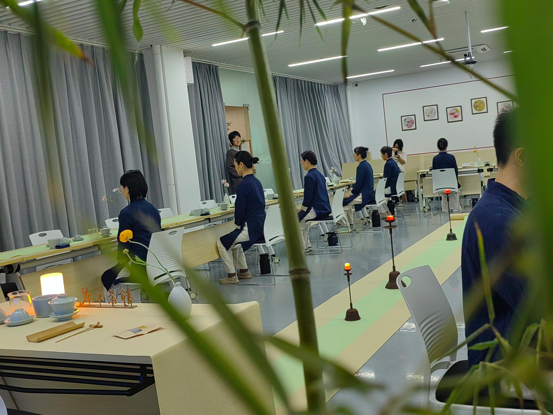 推开门,雅致的气息扑面而来。教室里,精心布置的茶席宛如一幅诗意画卷铺展眼前。素色的桌布上,古朴的茶器错落有致,青瓷茶碗泛着温润的光泽,竹制茶则、茶夹静静伫立,一旁插着几枝当季的洋牡丹,为整个空间增添了一抹自然的灵动。身着素雅茶服的茶人早已各就各位,身姿挺拔,眉眼含笑,等待着茶会的正式开启。