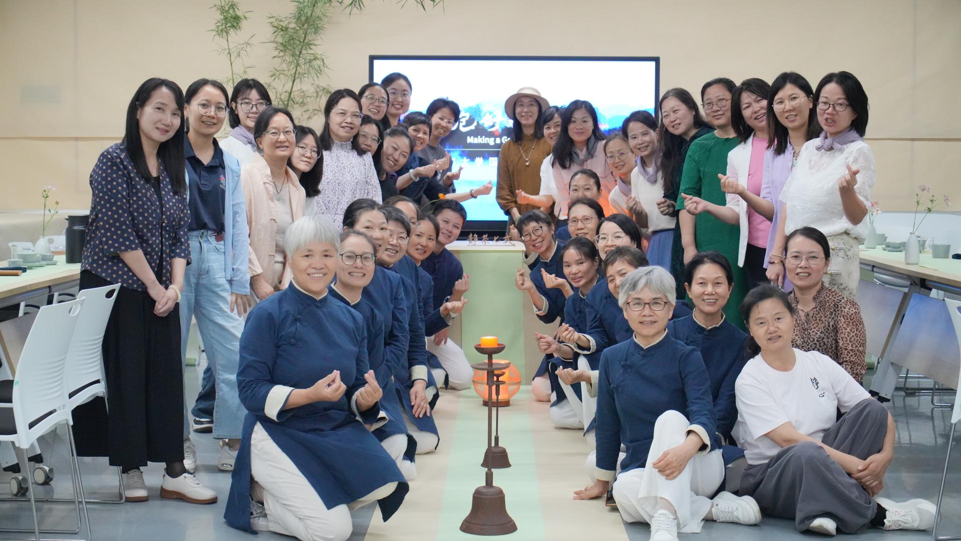 到了实操环节,老师们纷纷跃跃欲试。茶人老师们耐心十足,从翻杯的手势,到公道杯的使用角度,甚至连嘴巴对着自己这样的小小细节,都手把手地指导。老师们学得认真,时而皱眉思考,时而反复练习,在一次次尝试中逐渐掌握要领。不一会儿,教室里茶香四溢,大家都开始有模有样地泡起茶来,原本稍显紧张的氛围,也被茶香与欢笑声取代。