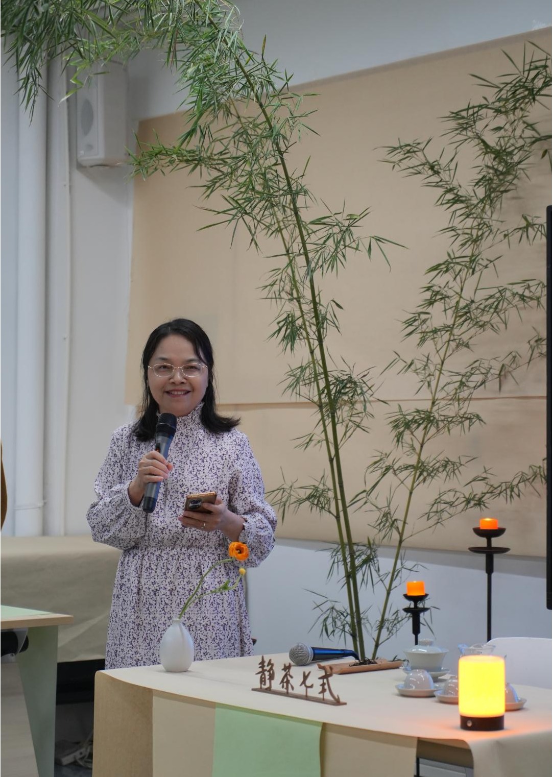 李晓艳老师从茶席布置讲起,她轻声细语地阐述着每一件茶器摆放的讲究,每一处细节的深意,让大家明白茶席不仅是器物的陈列,更是主人心境与审美的表达。随后,她着重介绍静茶七式?!案卸餍欣瘛?,是对自然馈赠的虔诚敬意;“静心备器”,在整理茶器的过程中沉淀心绪;“煮水听茗”,倾听水沸之声,感受时间的流淌;“温器传香”,温热茶器,唤醒茶香;“泡茶醒心”,以专注之心冲泡茶叶;“平等分茶”,将茶汤均匀分给每一位客人,传递平等与分享的理念;“吃茶去”,在品饮中感悟生活真谛。