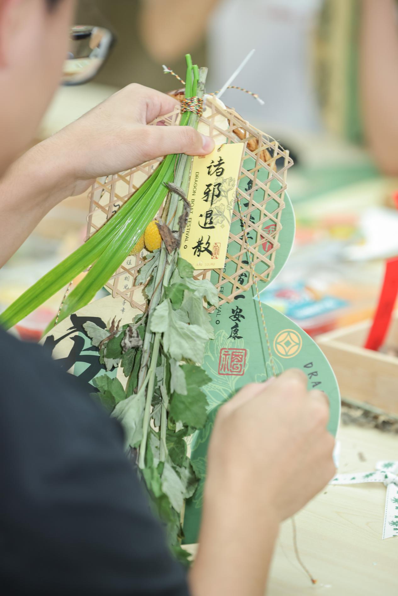 紧接着,在艾草菖蒲门挂DIY环节,大家将节日草本植物与彩绳、布饰巧妙结合,创作出一个个富有节日意象的挂饰。不少学生表示惊喜地发现,中国人用“自然植物”表达节日祝福的方式很有创意,也非常温馨。