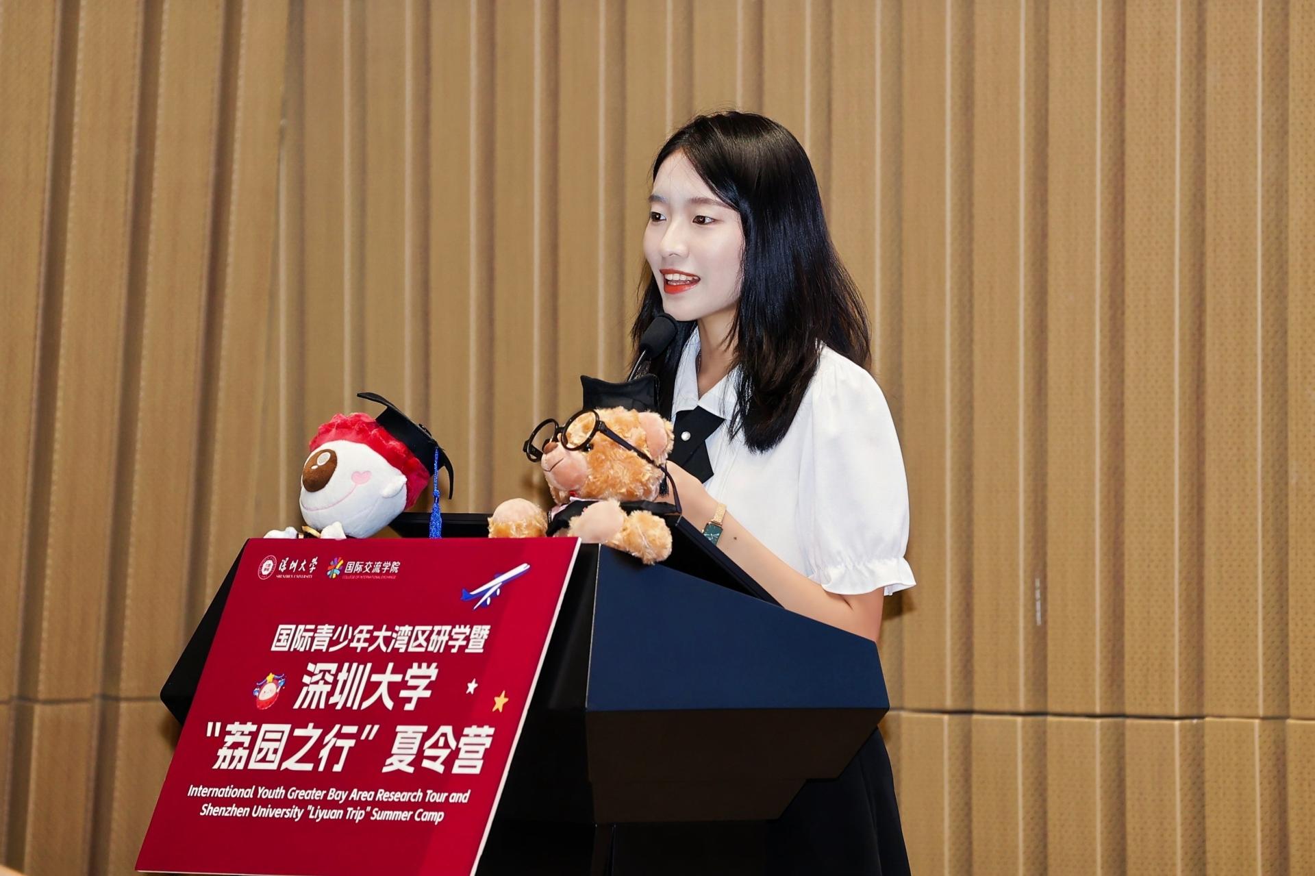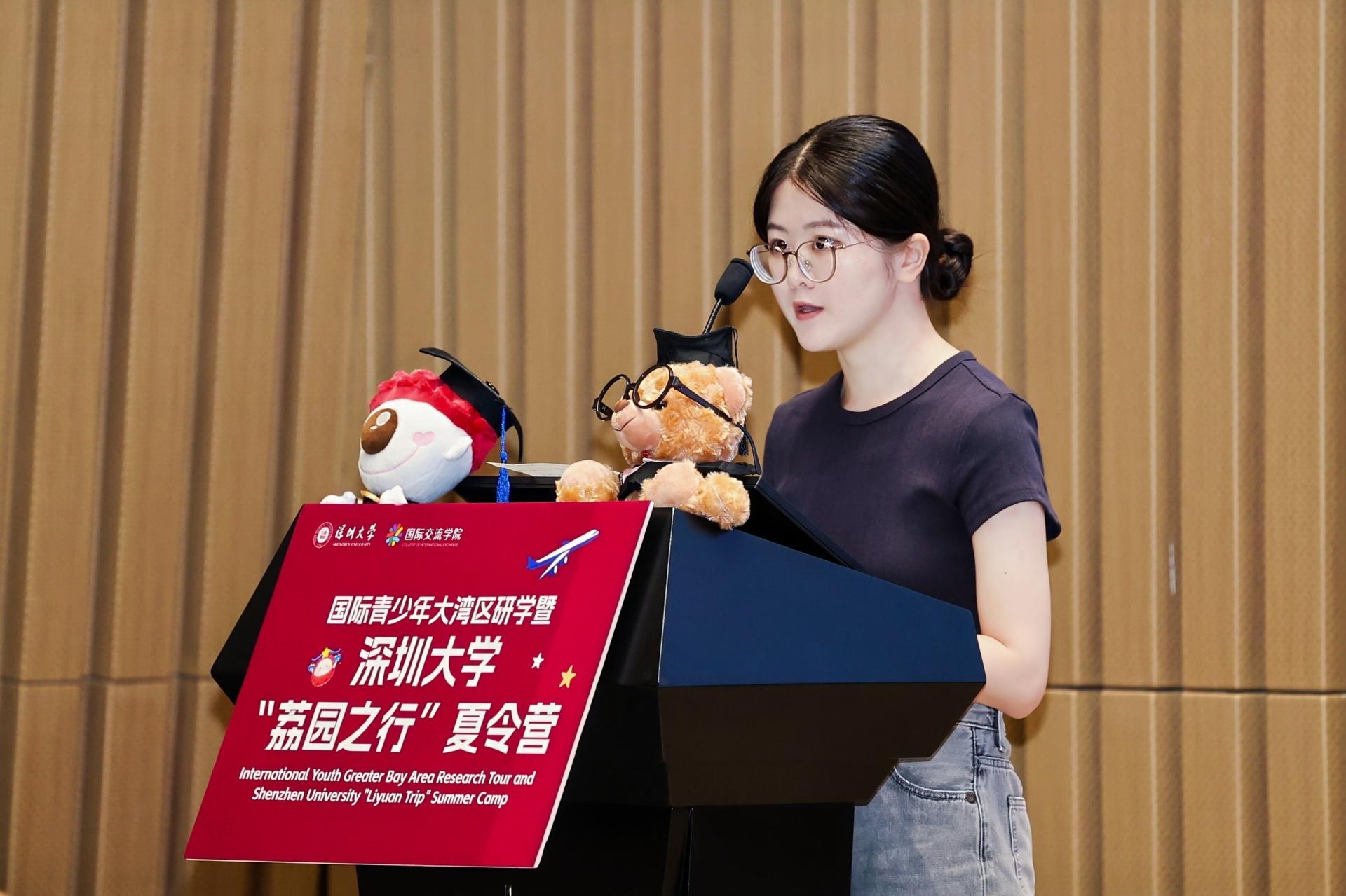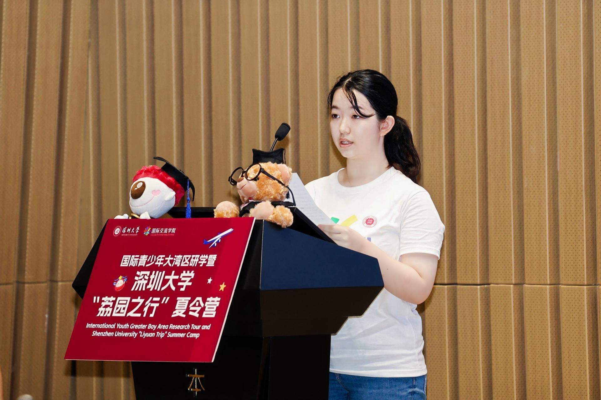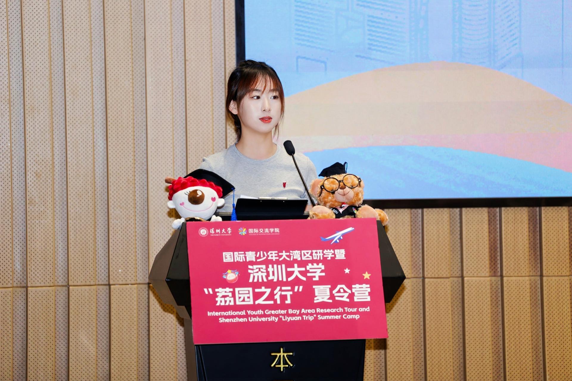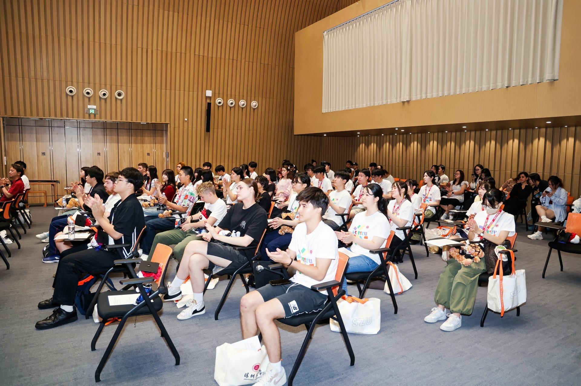 表演结束后,深圳大学国际交流学院副院长郑捷、深圳大运留学基金会秘书长陆林先后致辞,对远道而来的营员表示热烈欢迎,寄语大家在夏令营中收获知识与友谊。教师代表张海婷、学生志愿者代表魏泽佳(中国)和与仪聪美(日本)、营员代表Thirioux Dylan(法国)、船岡綾乃(日本)也依次发言,从不同视角表达了对本次夏令营的期待。蒋冉晨老师则详细介绍了夏令营的日程及须知,为营员研学筑牢保障。最后,全体人员齐聚镜头前合影留念,将这一充满期待的时刻定格。随后的自由交流环节里,营员们脸上渐渐漾开笑意,或用刚学的汉语尝试对话,或好奇分享家乡见闻,跨越国籍与文化差异的友谊种子,在轻松的交流氛围中悄然播撒。