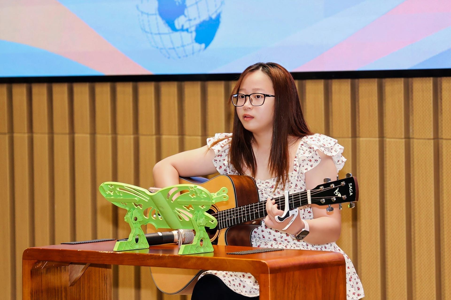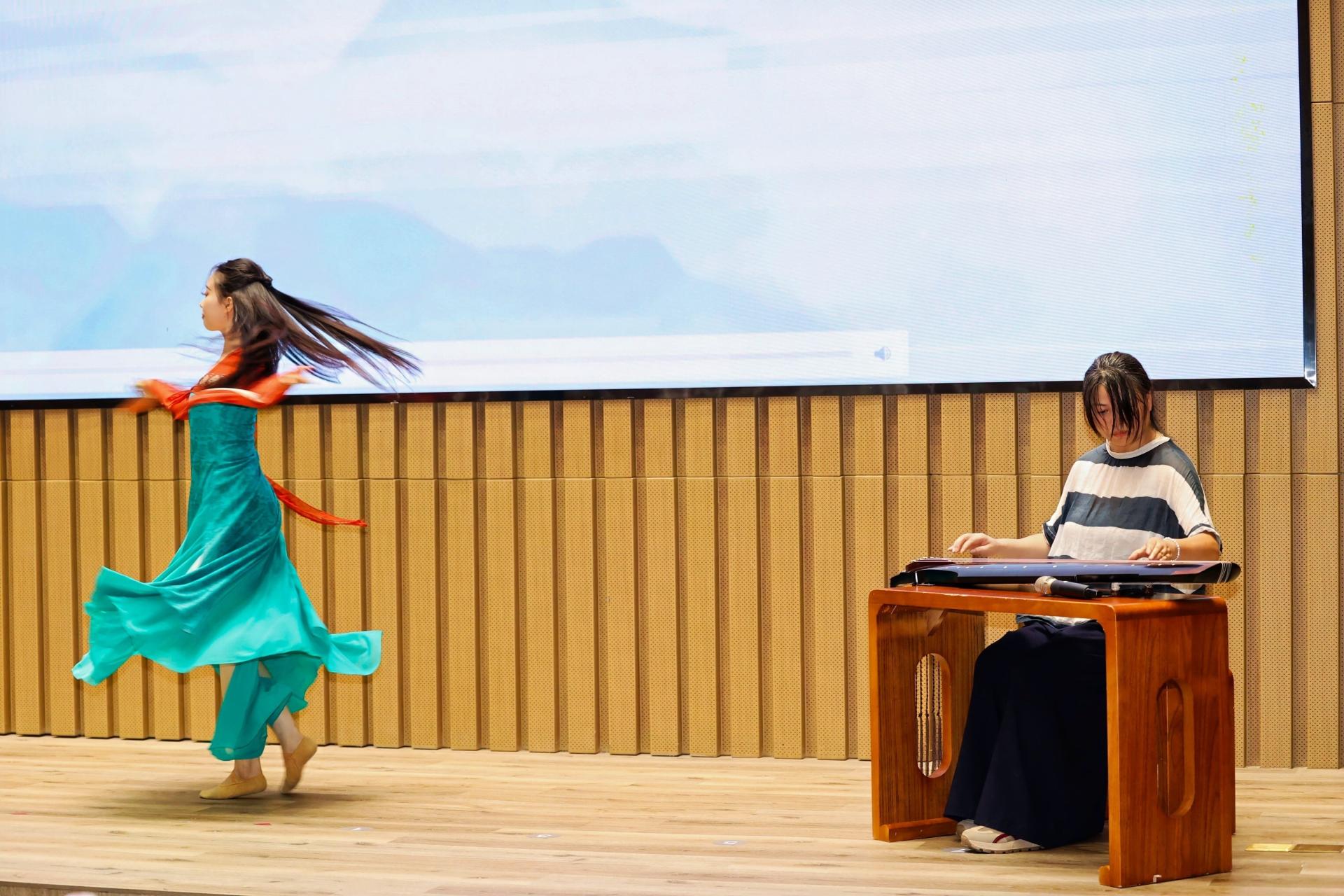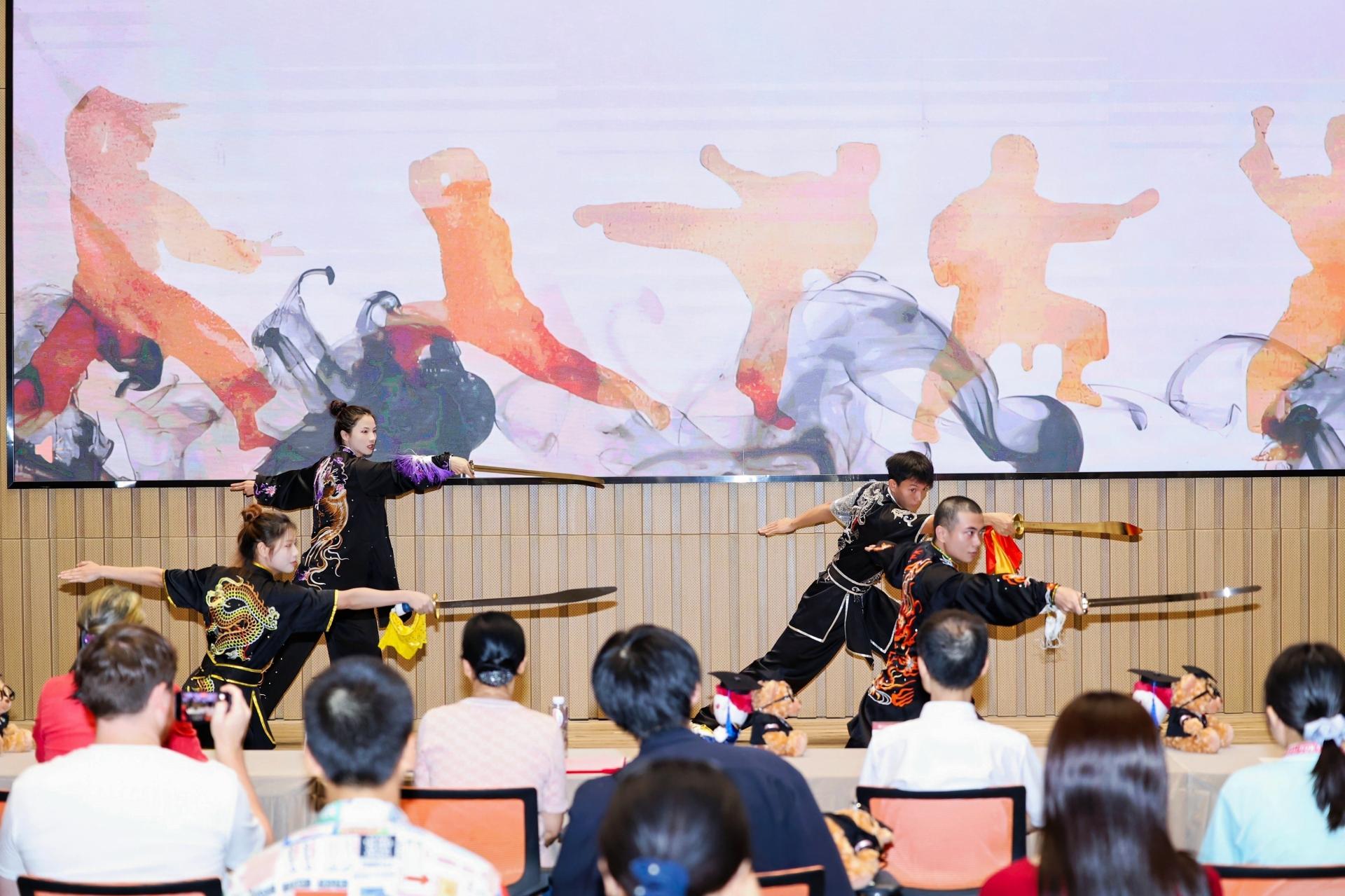 开营仪式伊始,宣传视频带领全场走进深圳大学这所充满活力与创新的高校,展现其浓厚学术氛围与青春活力风貌。随后,暖场表演节目精彩迭出:李峰玲、赖嘉慧带来古琴伴舞《关山月》,古典韵律与优美舞姿交融;深圳大学武术队带来气势磅礴的中国武术串烧,诠释中华武术的刚健气魄;印度尼西亚籍学生杨晶晶吉他弹唱《起风了》,用音乐传递青春共鸣。
