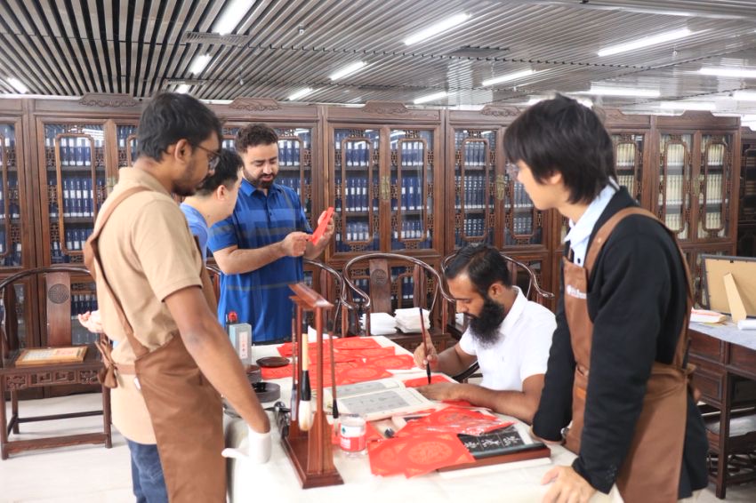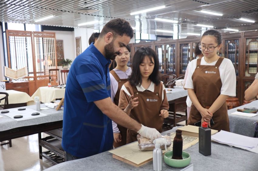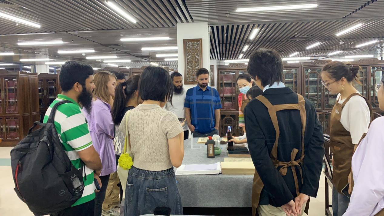 深圳大学国际交流学院、深圳大学“以文润心”国情教育工作室基地联合深圳大学图书馆,于2024年11月13日在汇典楼6楼举办了一场拓印及古籍装帧体验。国际交流学院秦晴副书记和李峰玲老师带领10多名来自南非、巴基斯坦、孟加拉、马来西亚、苏丹等国家以及中国香港地区的本科生、研究生和交换生参与了此次活动。现场布置古香古色,仿佛让人穿越回古代。