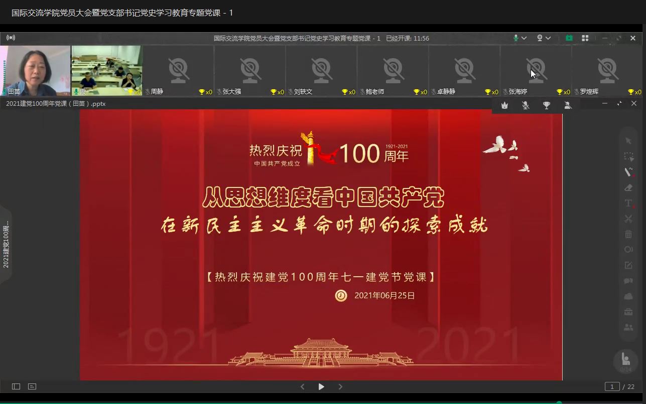 为深入开展党史学习教育,6月25日下午,国际交流学院召开党员大会暨党支部书记专题党课。根据疫情防控需要,本次采取“线上+线下”的形式召开会议,在朝夕楼201室设置线下会场,使用ClassIn平台设置线上会场。党总支书记黄雪峰主持会议,副院长杨爱姣、古维出席会议。