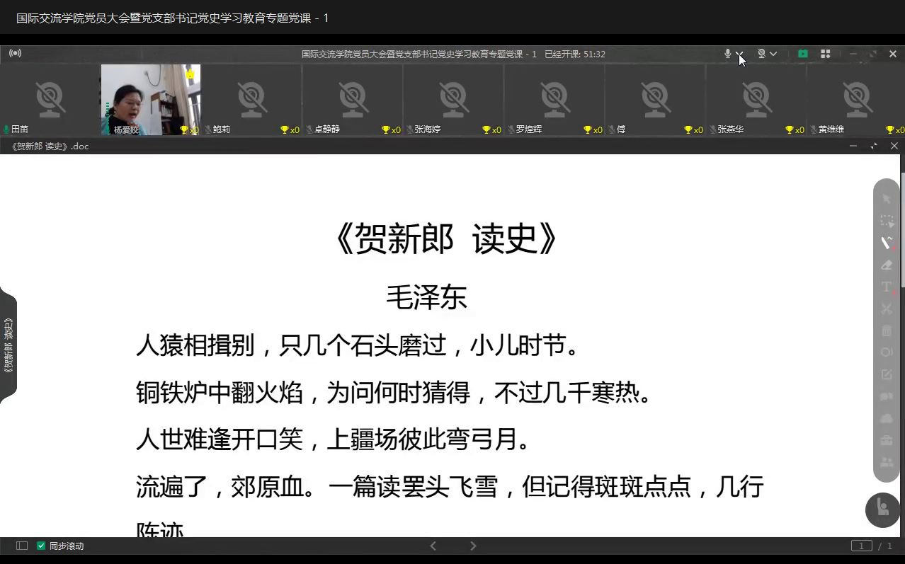 副院长、教工第二党支部书记杨爱姣则以毛泽东同志所作《贺新郎·读史》一词为引,分两部分向与会人员宣讲课程。第一部分,介绍了诗词内含的从人类诞生到社会主义,纵贯近百万年。毛泽东同志的诗词风格豪放、气象雄浑,其中“歌未竟东方白”的“东方白”更是喻指中国革命的胜利为历史谱写了新篇章,犹如旭日东升,势必光华万丈。第二部分,介绍了作者毛泽东同志,带领与会党员梳理了毛泽东同志的生平事迹,回顾其对中国革命的不可争论的伟大贡献。