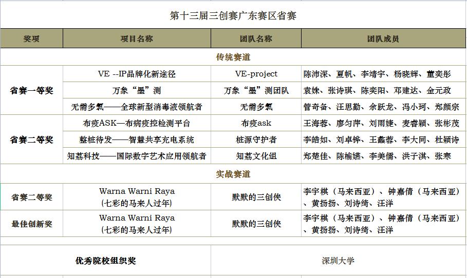 2023年6月10日,第十三届全国大学生电子商务“创新、创意及创业”挑战赛(以下简称三创赛)广东省选拔赛圆满落幕。深圳大学代表队在广东省的众多参赛队伍中脱颖而出,取得了一等奖三项、二等奖四项的好成绩。在本次三创赛中,深大学子展现了良好的精神面貌,真正做到了赛出风格、赛出水平,受到了各参赛院校的高度认可和一致好评。