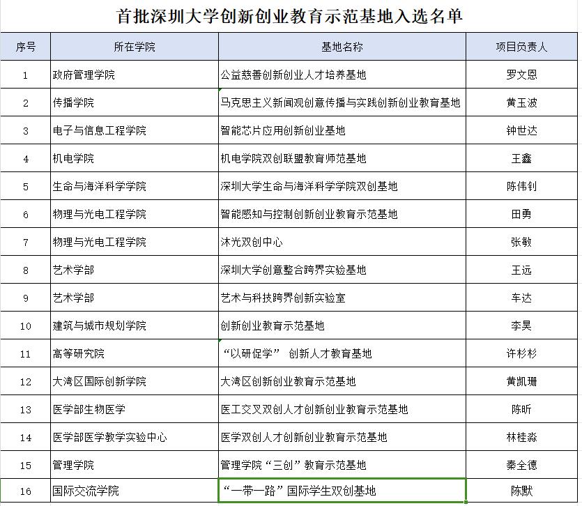 为深化实施科教融汇、产教融合、协同育人的发展理念,进一步提升深圳大学在创新创业领域的影响力,教务部创新创业教育中心组织了首批“深圳大学创新创业教育示范基地”的申报及立项工作。经过激烈竞争,国际交流学院陈默老师申报的“‘一带一路’国际学生双创基地”成功入选,成为首批获此殊荣的16个项目之一。