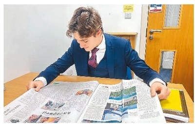 格列布在阅读刊登有自己文章的《人民日报海外版》。