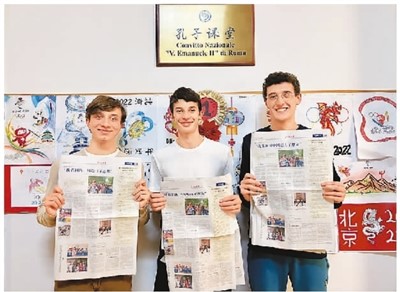 图为就读于罗马国立住读学校的三位同学收到了刊有他们故事的《人民日报海外版》。