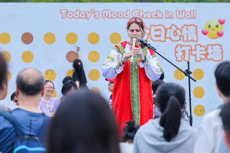 除了精彩纷呈的摊位,来自澳门城市大学、哈尔滨工业大学(深圳)、华南理工大学、广东外语外贸大学、华南师范大学、文理实验学校(集团)科创学校、深圳大学等七所粤港澳大湾区高校、中学的中外学生动情演绎各国传统民族文化特色的歌曲与舞蹈。深圳大学国际合唱团原创歌曲《东方之梦》传递出对中国的热爱与祝福,彰显了音乐跨越国界的力量。澳门城市大学艺术团的原创舞蹈《游塘忆莲》以荷花为灵感,融合澳门历史文化元素,展现了澳门从历史沧桑走向繁荣发展的历程。二十余位来自世界各国国际学生,身着各国传统服饰的留学生们款款而行,通过服装展示各国的文化特色与历史传承。演出现场热闹非凡,不时爆发阵阵喝彩与掌声。